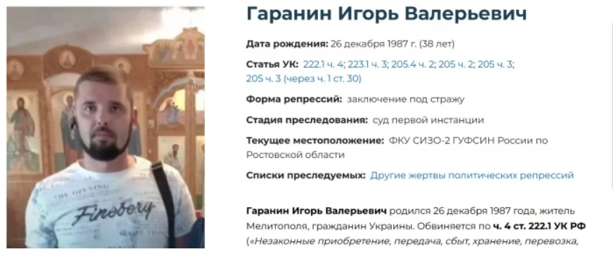 Ігор Валерійович Гаранін (38 років): Викрадений 27 квітня 2023 року. Звинувачується у виготовленні вибухівки та участі в терактах. Перебуває в СІЗО-2.