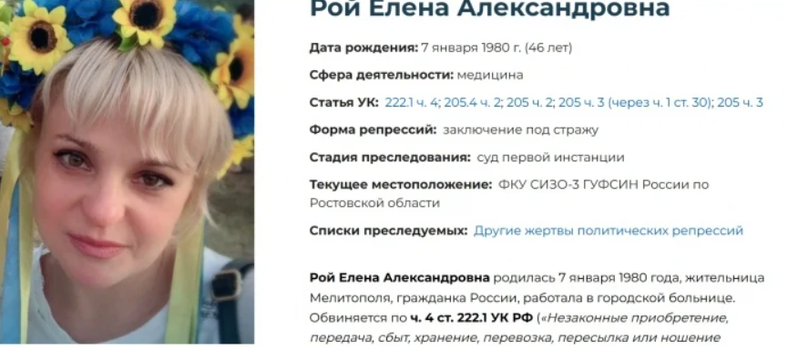 Олена Олександрівна Рой (46 років): Медик міської лікарні Мелітополя. Дружина командира другого патрульного батальйону військової частини 3033 підполковника Юрія Роя, який загинув у перші дні повномасштабного вторгнення в Маріуполі.